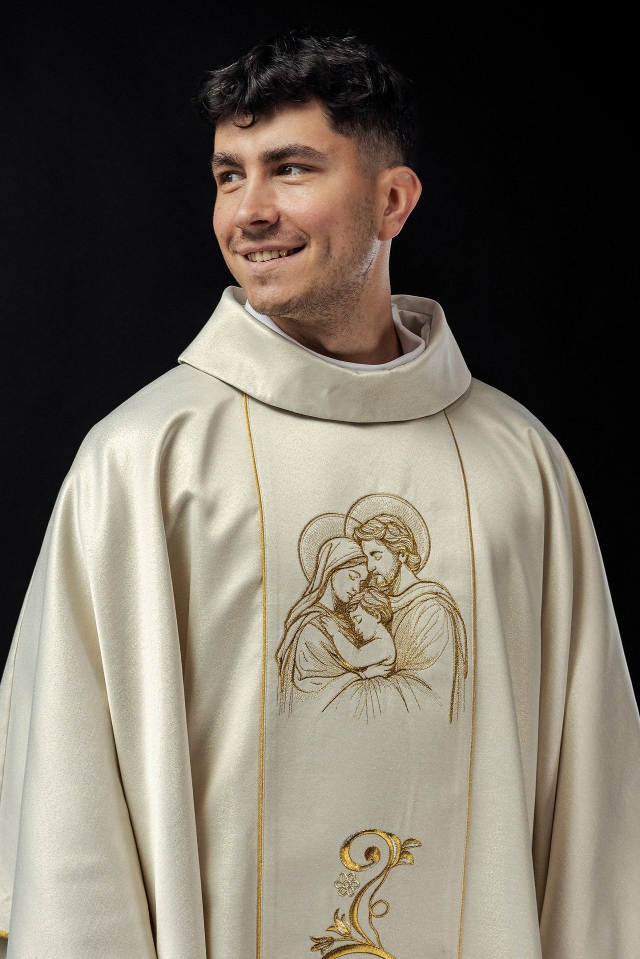 Kasel aus hochwertigem, glattem Stoff, dekoriert mit einem Band mit dem gestickten Bild der Heiligen Familie.