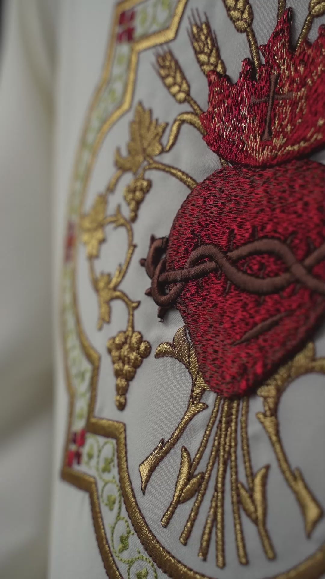 Die mit dem Herz-Jesu-Symbol reich bestickte Kasel in Ecru eignet sich perfekt für die ersten Freitage des Monats, Votivmessen über das Heiligste Herz Jesu, die Fronleichnamsmesse und das Fest des Allerheiligsten Sakraments.