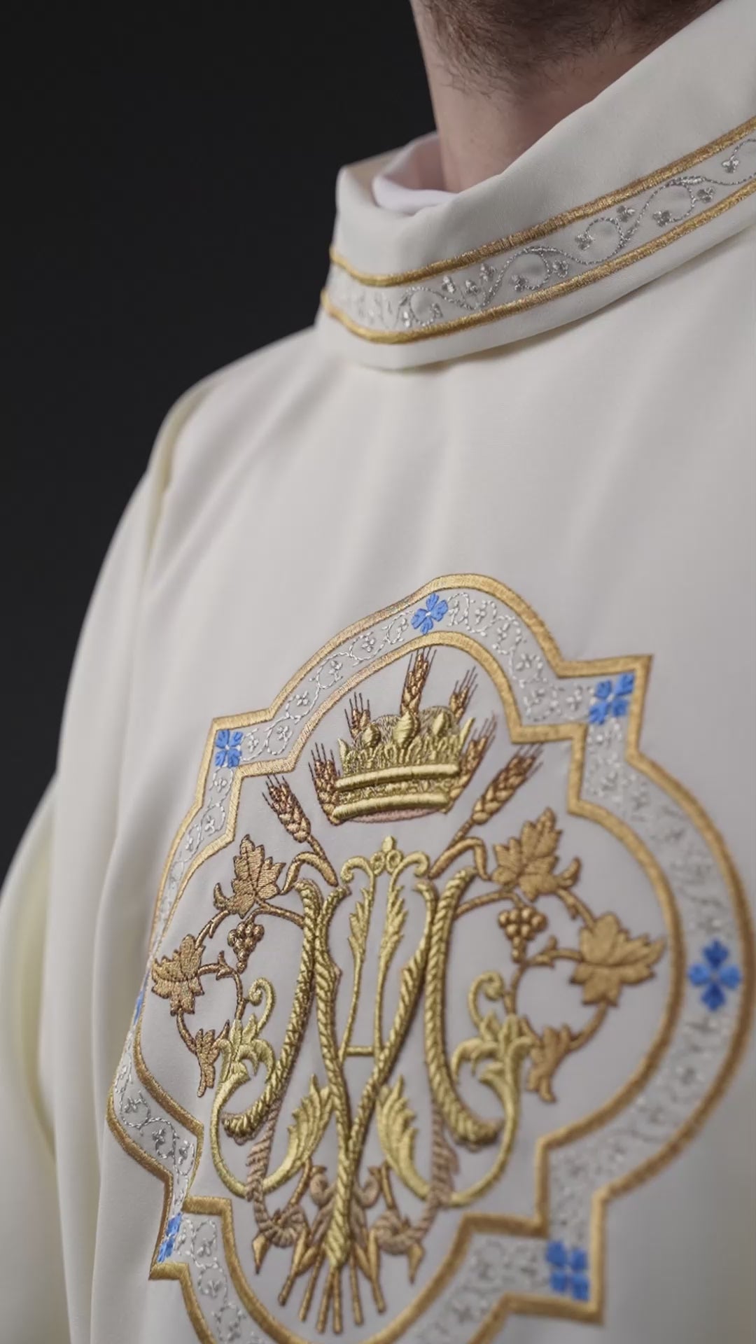 Tauchen Sie ein in eine Atmosphäre von göttlicher Schönheit und Feierlichkeit mit unserer Marienkutte, die meisterhaft zu Ehren der Heiligen Jungfrau Maria gefertigt wurde. Unser Messgewand ist eine Kombination aus exzellentem Qualitätsstoff, gestickten handwerklichen Details und tiefem Respekt für religiöse Traditionen.
