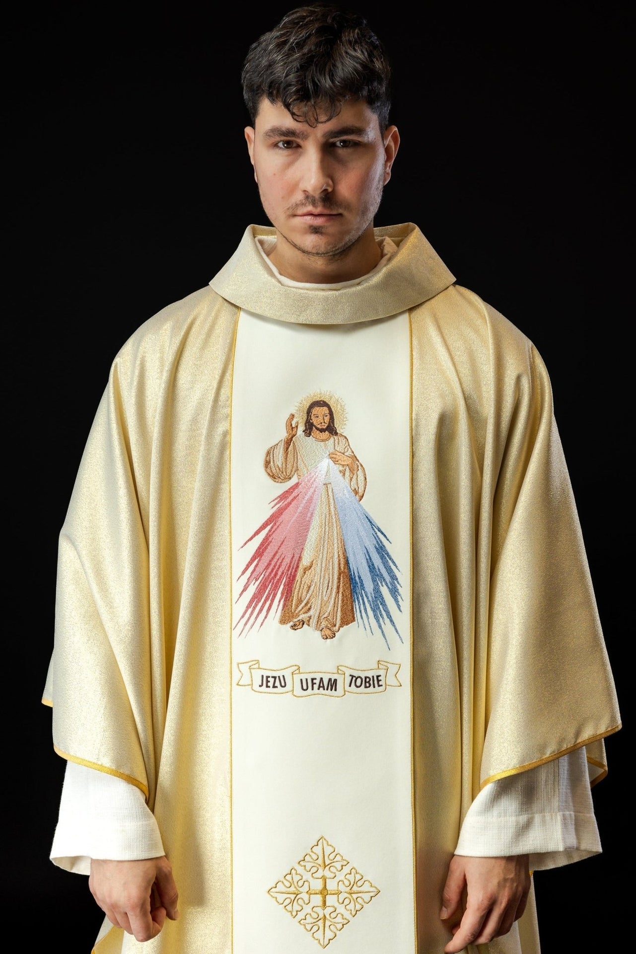 Messgewand aus hochwertigem glattem Stoff, verziert mit einem Gürtel mit einem gestickten Bild des Barmherzigen Jesus mit der Aufschrift "Jesus, ich vertraue auf dich". Das Ganze ist mit einer goldenen Satinpaspel versehen.