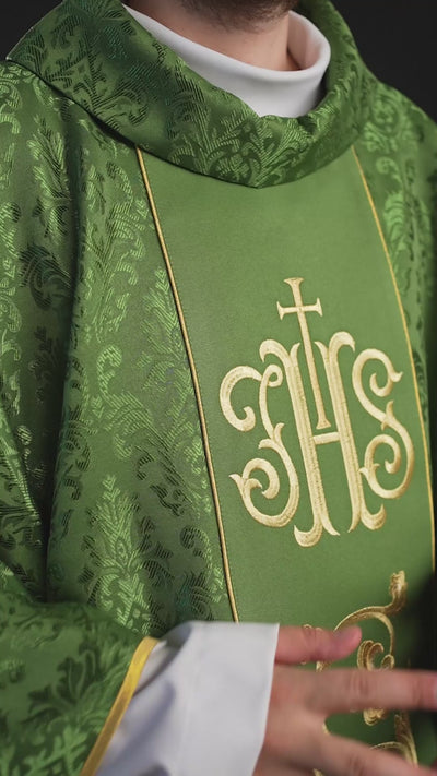 Grünes liturgisches Messgewand mit reich verziertem IHS-Gürtel