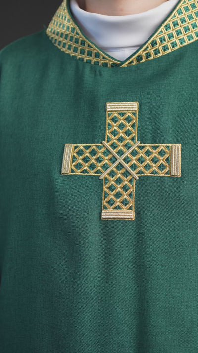 Diese Kasel in Grün mit gestickten goldenen Kreuzen und Kragen ist ideal für das Tragen während: