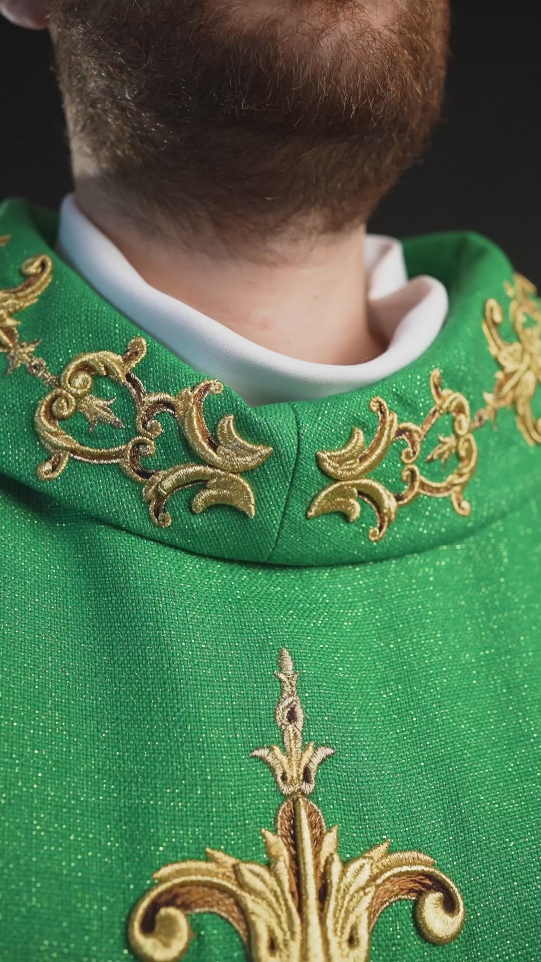 Die Kasel ist aus hochwertigem Stoff gefertigt und mit einer Goldfadenstickerei des eucharistischen Symbols verziert, das ein florales Motiv darstellt. Außerdem sind die Ränder der Kasel mit einer Satinborte in der Farbe der Kasel versehen, die perfekt zu dem goldgestickten floralen Motiv mit Kreuzen passt. Außerdem ist die Kasel in allen liturgischen Farben erhältlich.