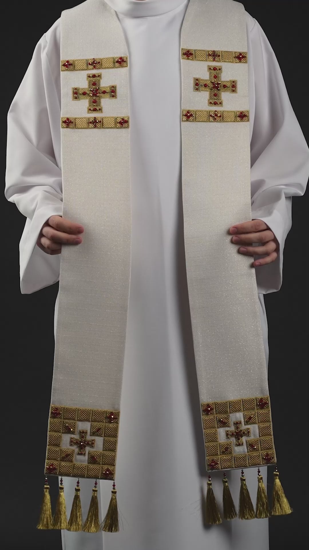 Diese handgefertigte Stola ist eine einzigartige Verbindung von Tradition und künstlerischem Können. Mit größter Sorgfalt hergestellt, verziert mit Stickerei und Steinen, stellt sie ein unverwechselbares Element liturgischer Gewänder dar.