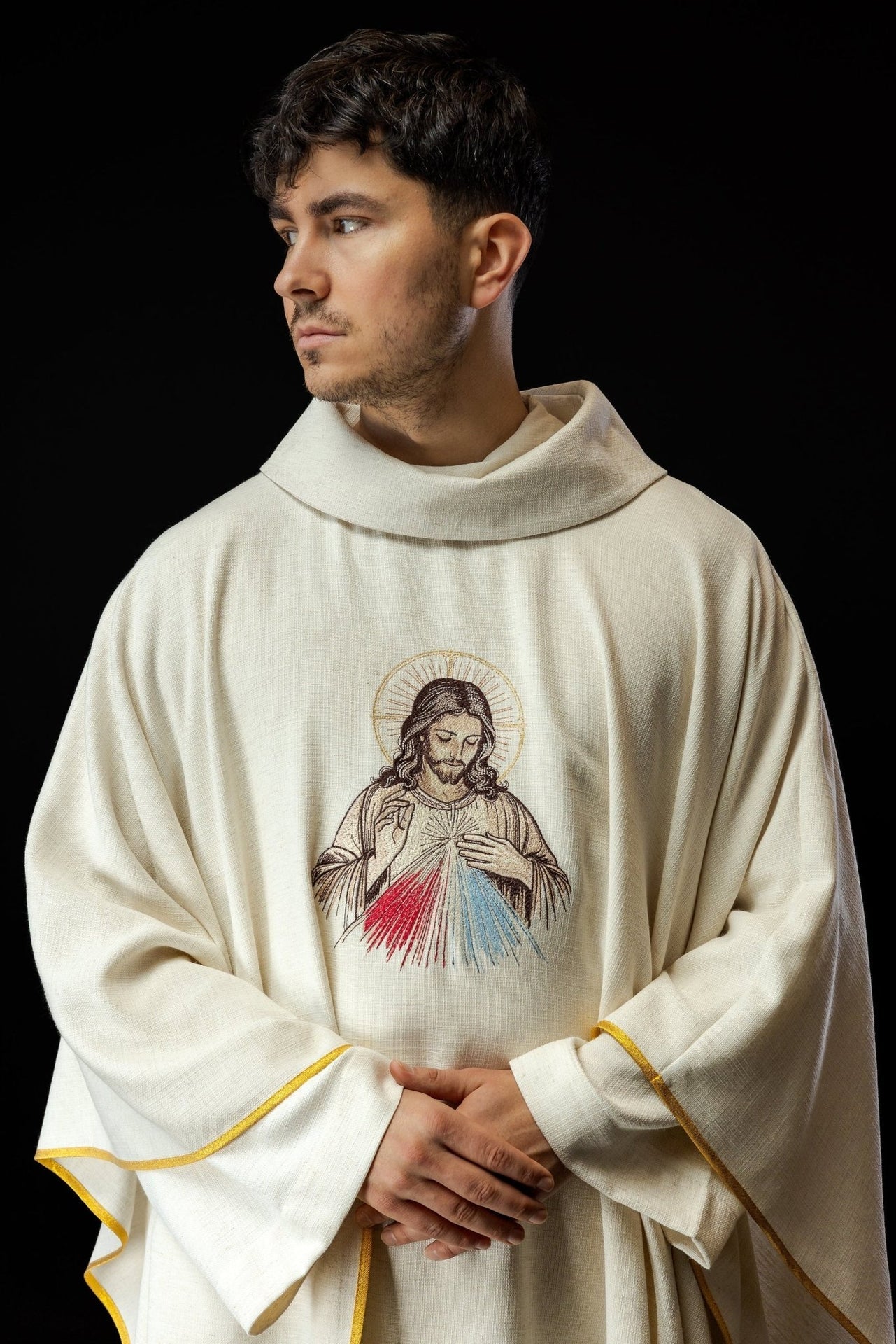 Kasel mit Gürtel aus hochwertigem Stoff, verziert mit einer Stickerei des Bildes von Jesus dem Barmherzigen.