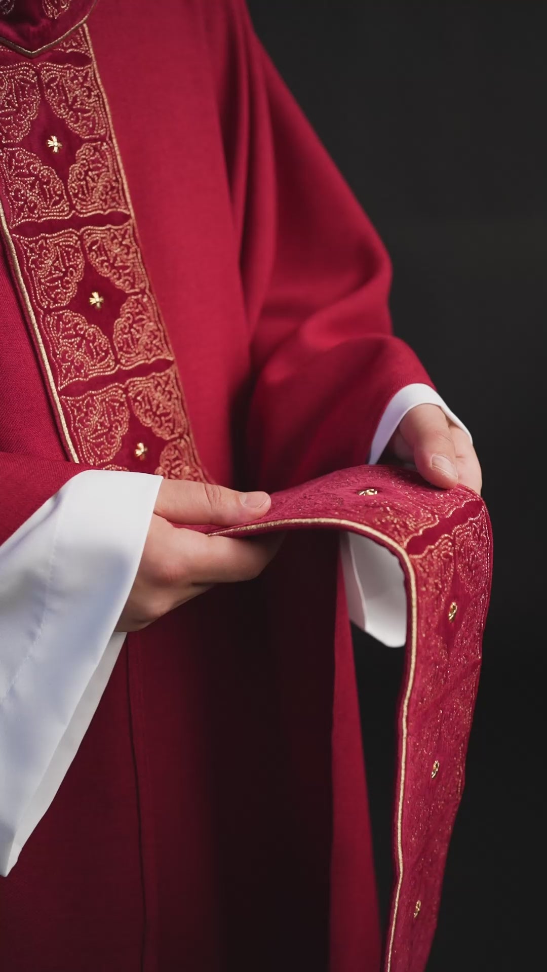 - Der reich verzierte Gürtel und Kragen mit Stickereien, die religiöse Motive darstellen, wie Kreuze. Die goldene Stickerei sieht auf dem roten Stoff wunderschön aus, verleiht dem Messgewand raffinierten und majestätischen Charakter.
