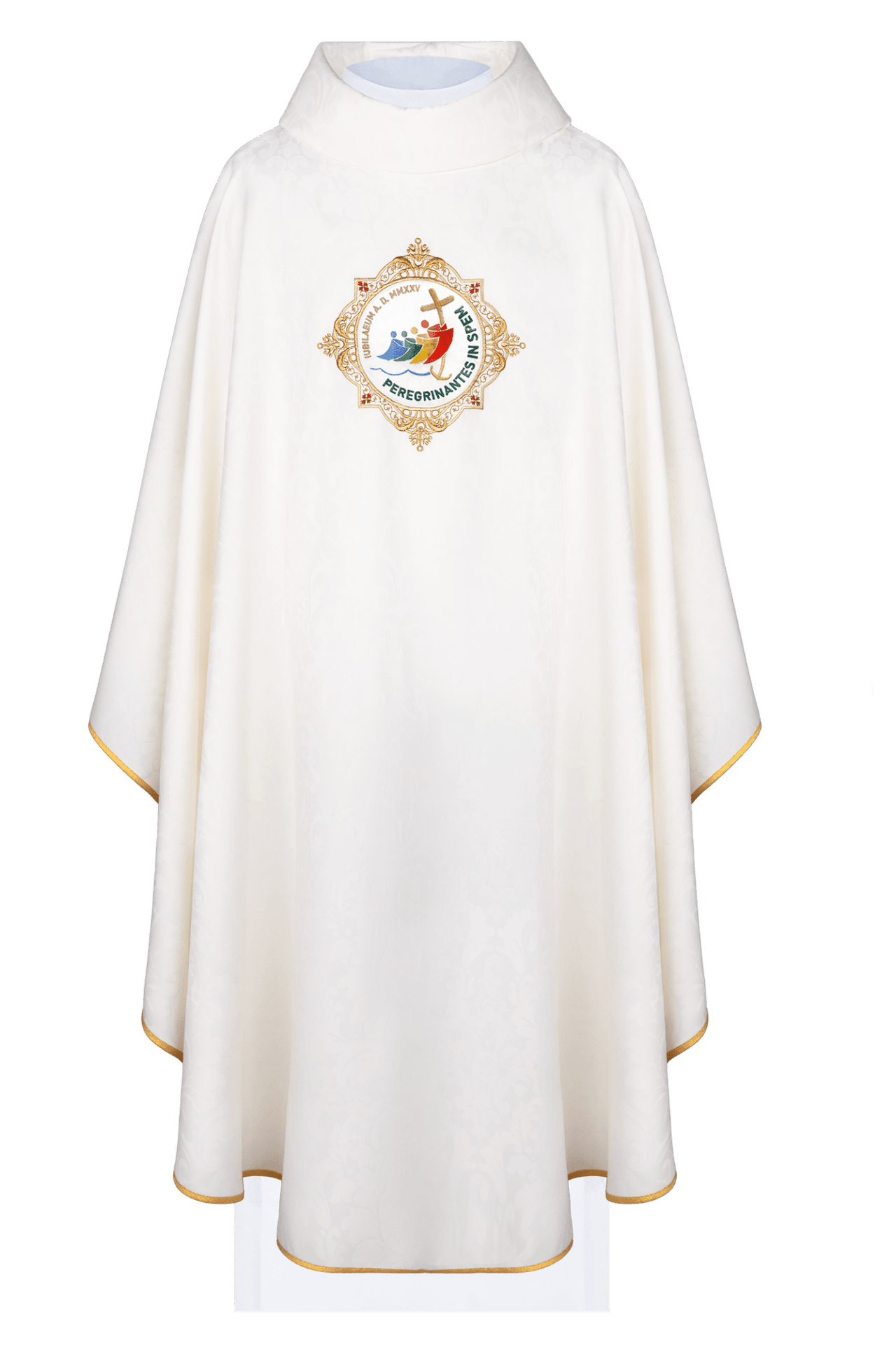 Kasel mit Stickerei um das Jubiläumswappen in Ecru