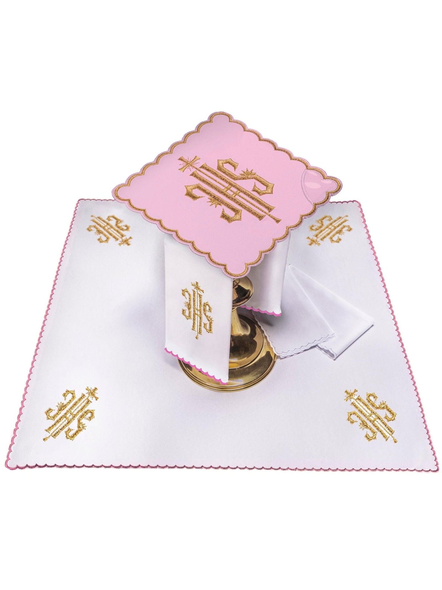 Kelchwäsche aus hochwertigem Stoff, verziert mit einer Stickerei mit einem eucharistischen Motiv aus Goldfäden, auf dem das IHS-Symbol abgebildet ist. Das Set besteht aus vier Teilen: einer rosafarbenen Palme und einem Korporale, einem Purifikator und einem Handtuch. Dank des verbindenden Motivs mit dem IHS-Symbol bildet das Set ein kohärentes Ganzes.
