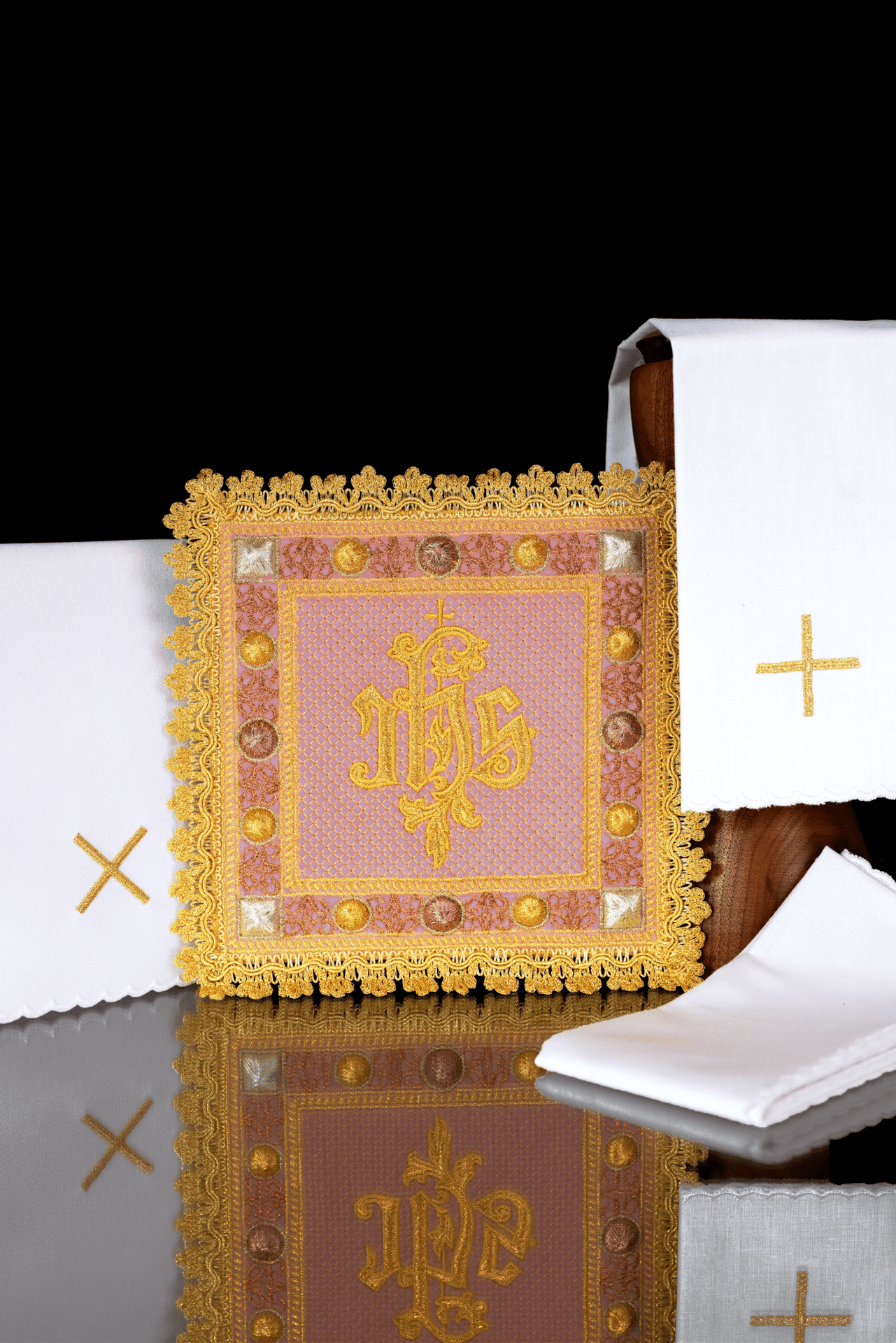 Kelch aus Samt in Rosa mit gesticktem IHS-Symbol