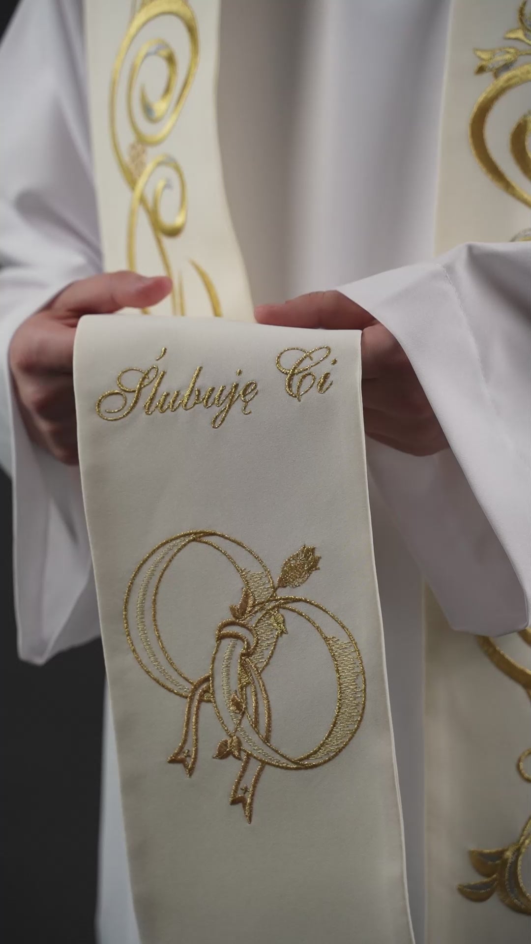 • Reiche Stickerei mit dem Hochzeitssymbol: Die Stola ist mit einer reichen Stickerei mit dem Hochzeitssymbol und der Aufschrift "Ich schwöre dir Treue" verziert, was ihr einen eleganten und feierlichen Charakter verleiht.