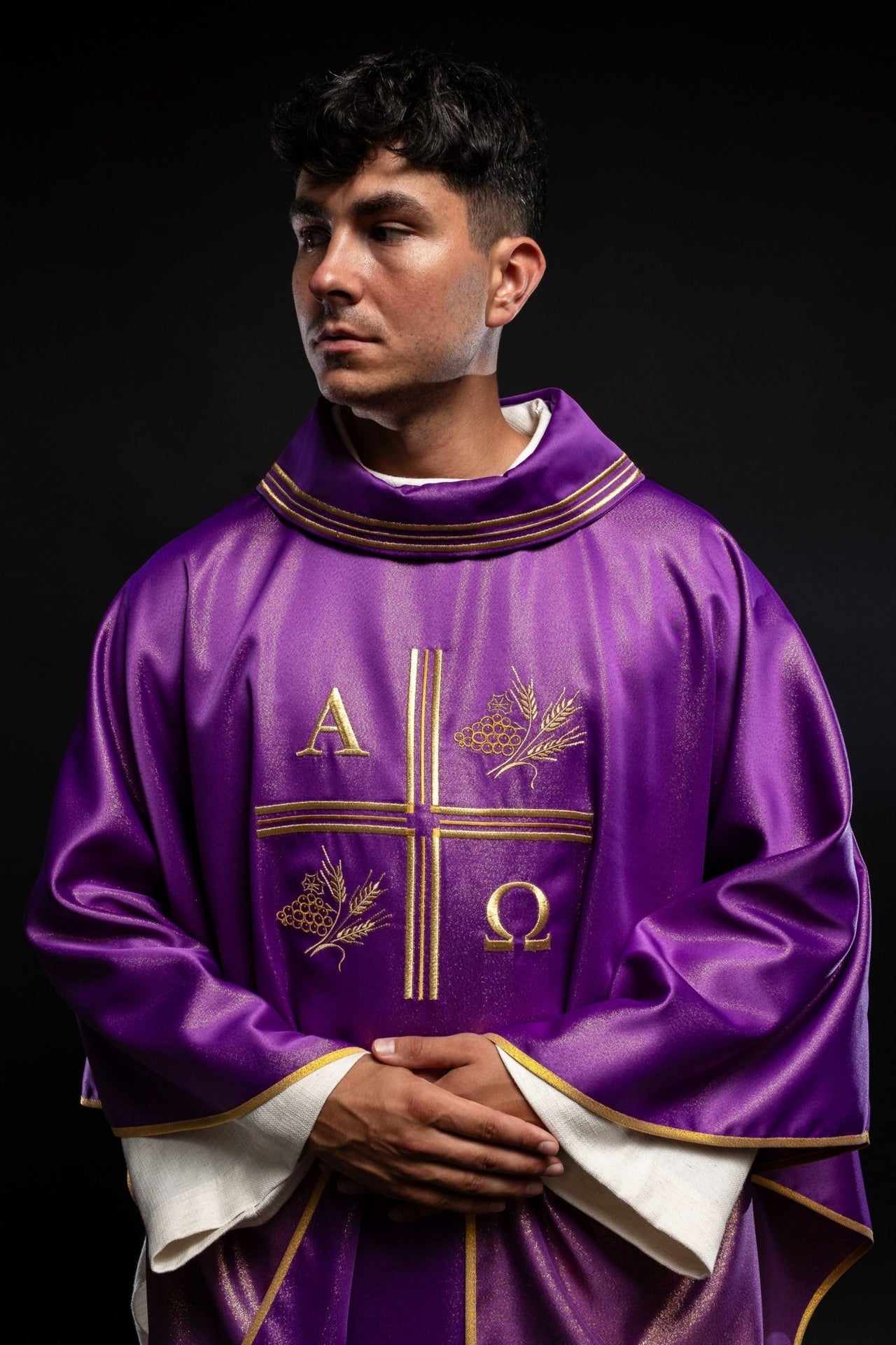 Unsere meisterhaft aus hochwertigem Stoff gefertigte Kasel ist der Inbegriff von Eleganz und tiefgründiger liturgischer Symbolik. Verziert mit einem gestickten Kreuz und den Motiven von Alpha und Omega sowie Ohren, strahlt unsere Kasel Majestät und Schönheit aus. Die satinierte Goldverzierung am Kragen harmoniert perfekt mit dem gestickten Kreuz und den Motiven von Alpha und Omega sowie den Ohren und verleiht dem liturgischen Gewand einen einzigartigen Glanz.