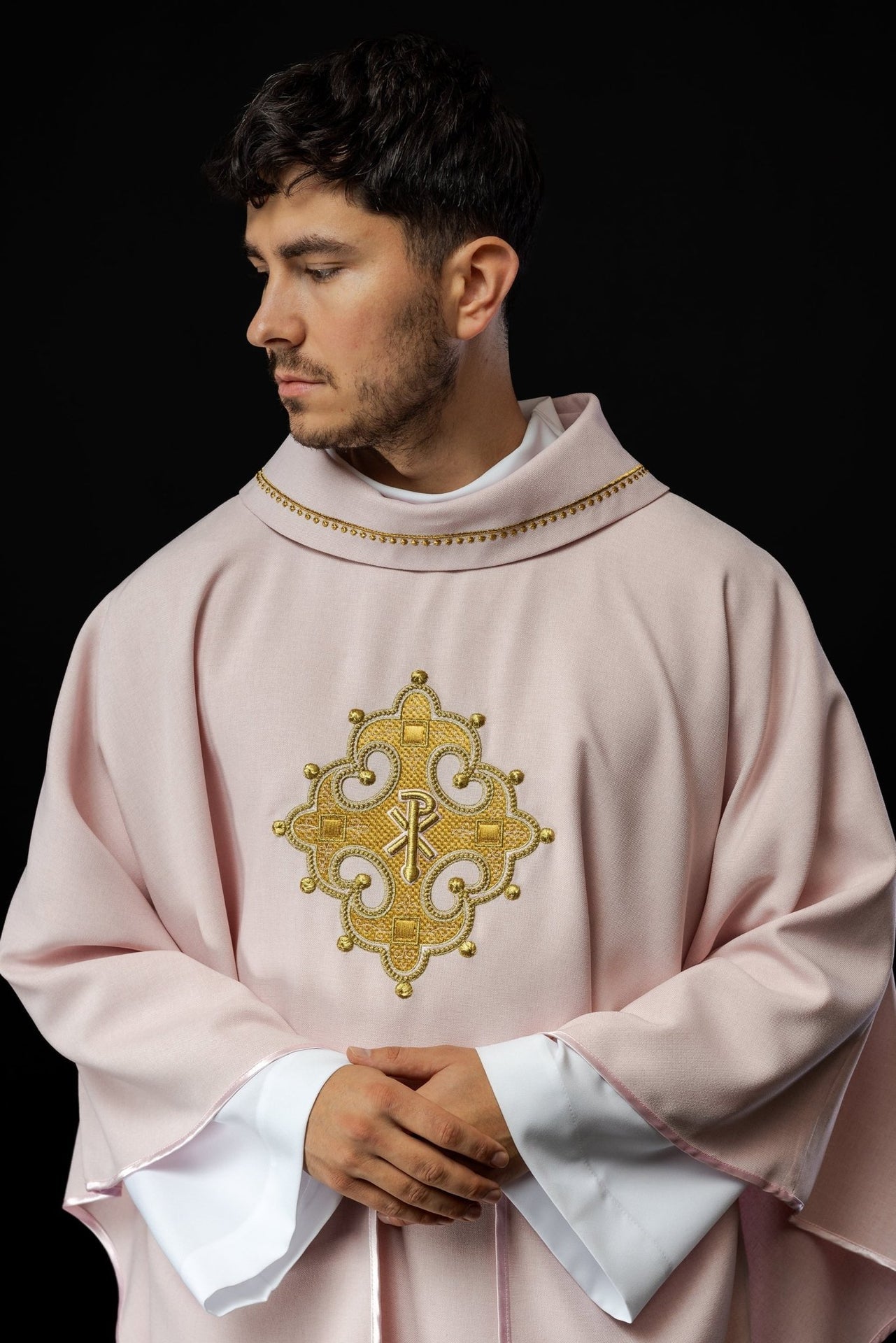 Messgewand mit gesticktem Kreuz und goldener Paspelierung am Kragen in rosa Farbe
