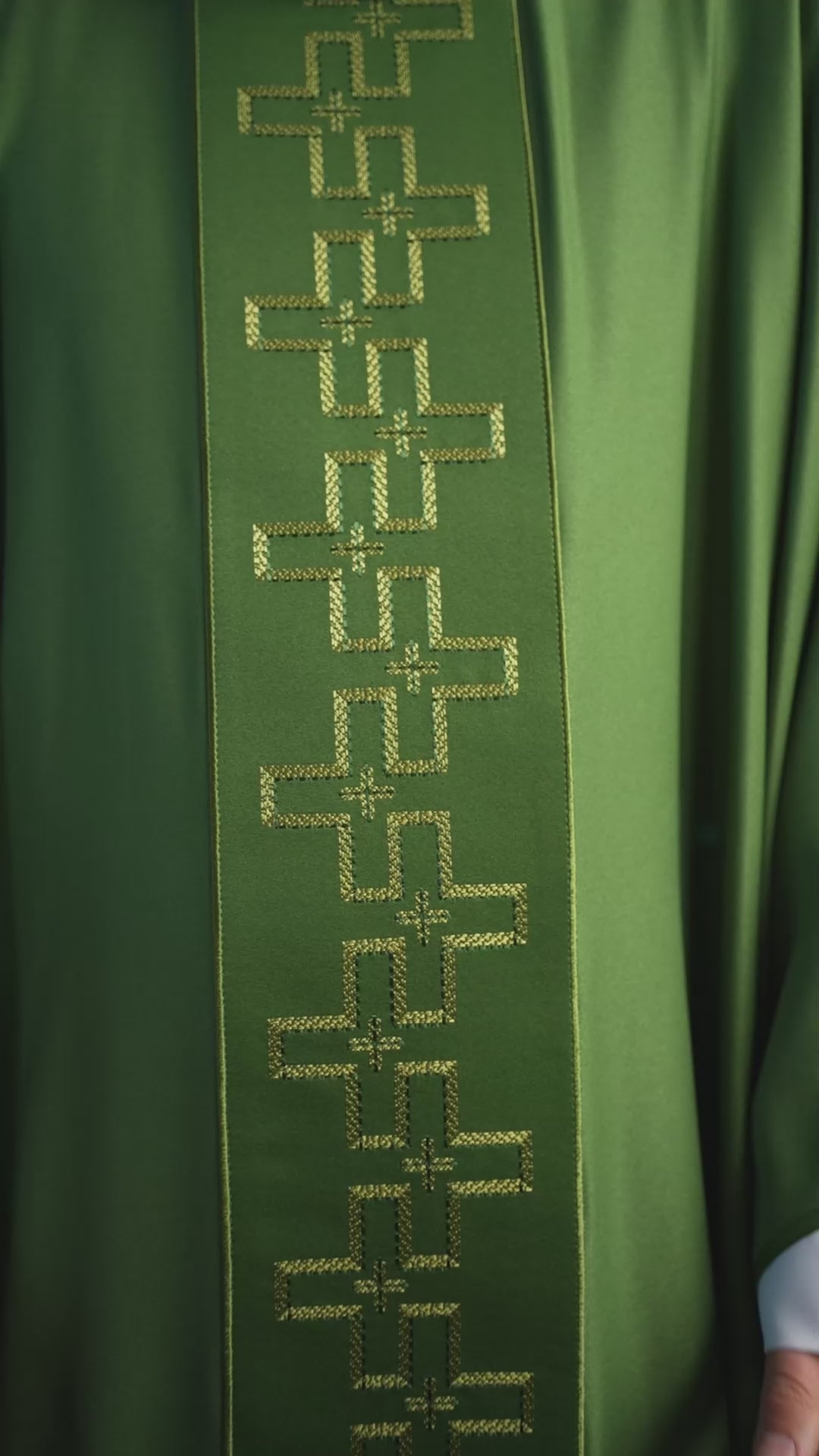 - Der reich verzierte Gürtel mit Stickereien, die Kreuze darstellen, ein Symbol des christlichen Glaubens. Die goldene Stickerei sieht auf dem grünen Stoff wunderschön aus, verleiht der Kasel einen eleganten und raffinierten Charakter..