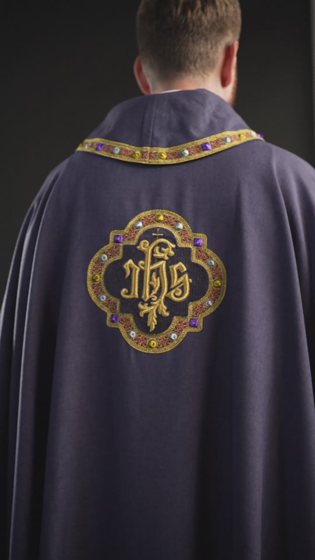 Unsere meisterhaft aus hochwertigem Stoff gefertigte Kasel ist der Inbegriff von Eleganz und tiefgründiger liturgischer Symbolik. Eine kunstvolle Kasel mit reich bestickten Paspeln um die IHS-Stickerei und den Kragen in Violett, unsere Kasel strahlt Majestät und Schönheit aus.