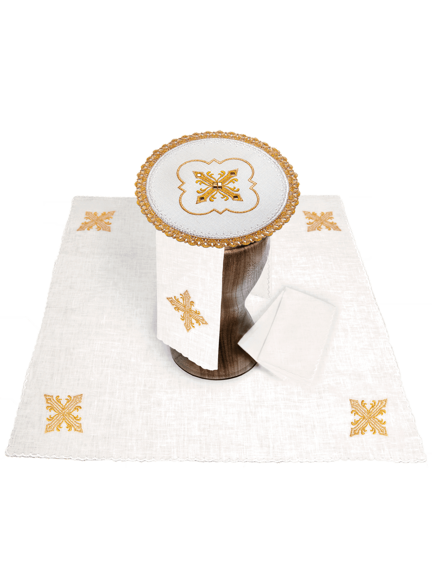 - Korporal - aus Naturstoff mit 100% LEN. Die Ecken sind mit goldenen Kreuzen bestickt und die Ränder sind mit einer gestickten Welle verziert. Seine Maße sind 47 cm x 47 cm.