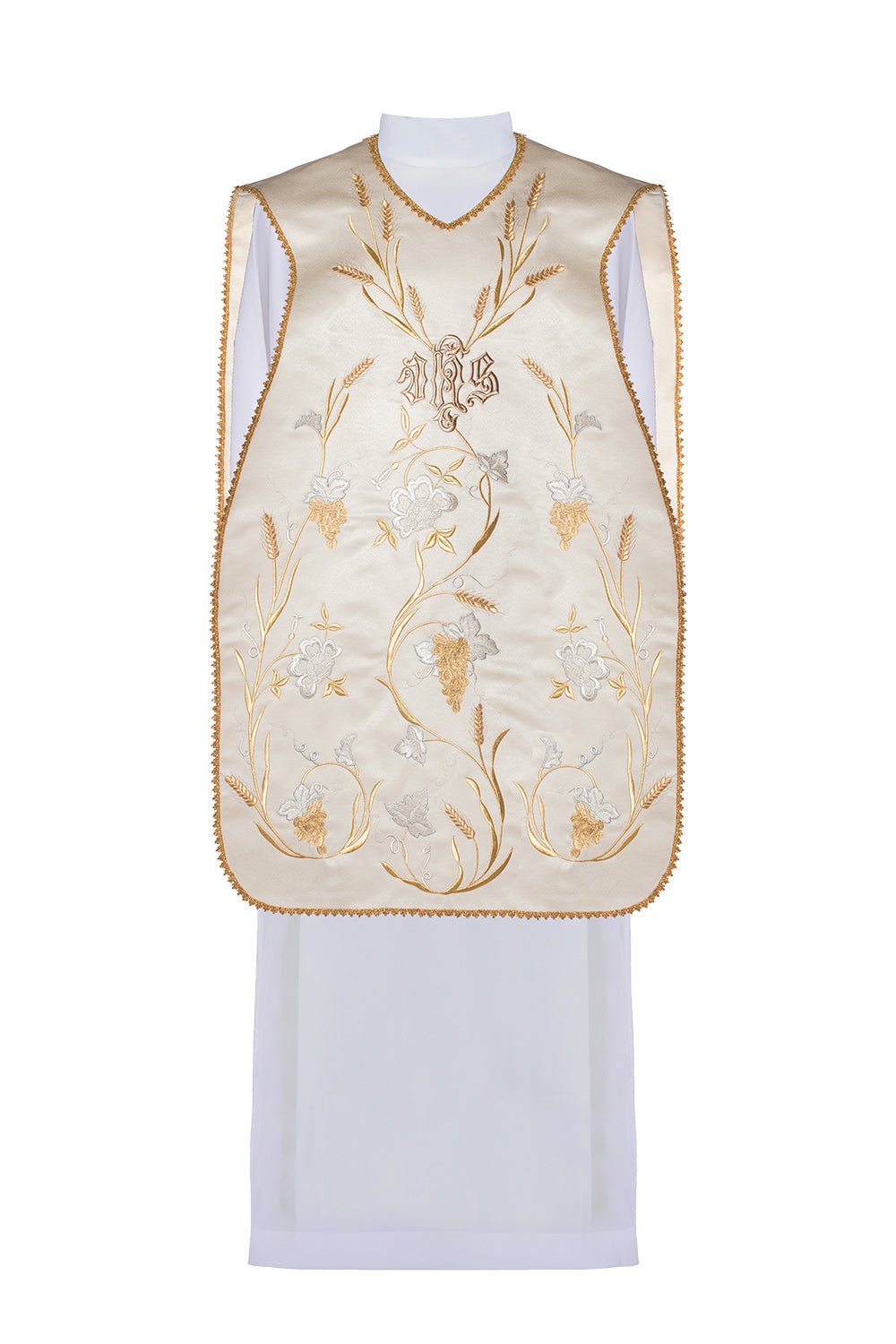 Römisches Messgewand aus hochwertigem einfarbigem Stoff, reich verziert mit dem Symbol des IHS, Ohren und Trauben. Alle Teile sind mit Goldsatin verziert. Erhältlich in allen liturgischen Farben.