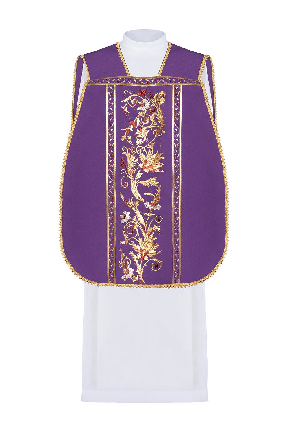 Römisches Messgewand aus hochwertigem einfarbigem Stoff, reich verziert mit dem Symbol des eucharistischen Kelches. Alle Teile sind mit Goldsatin verziert. Erhältlich in allen liturgischen Farben.