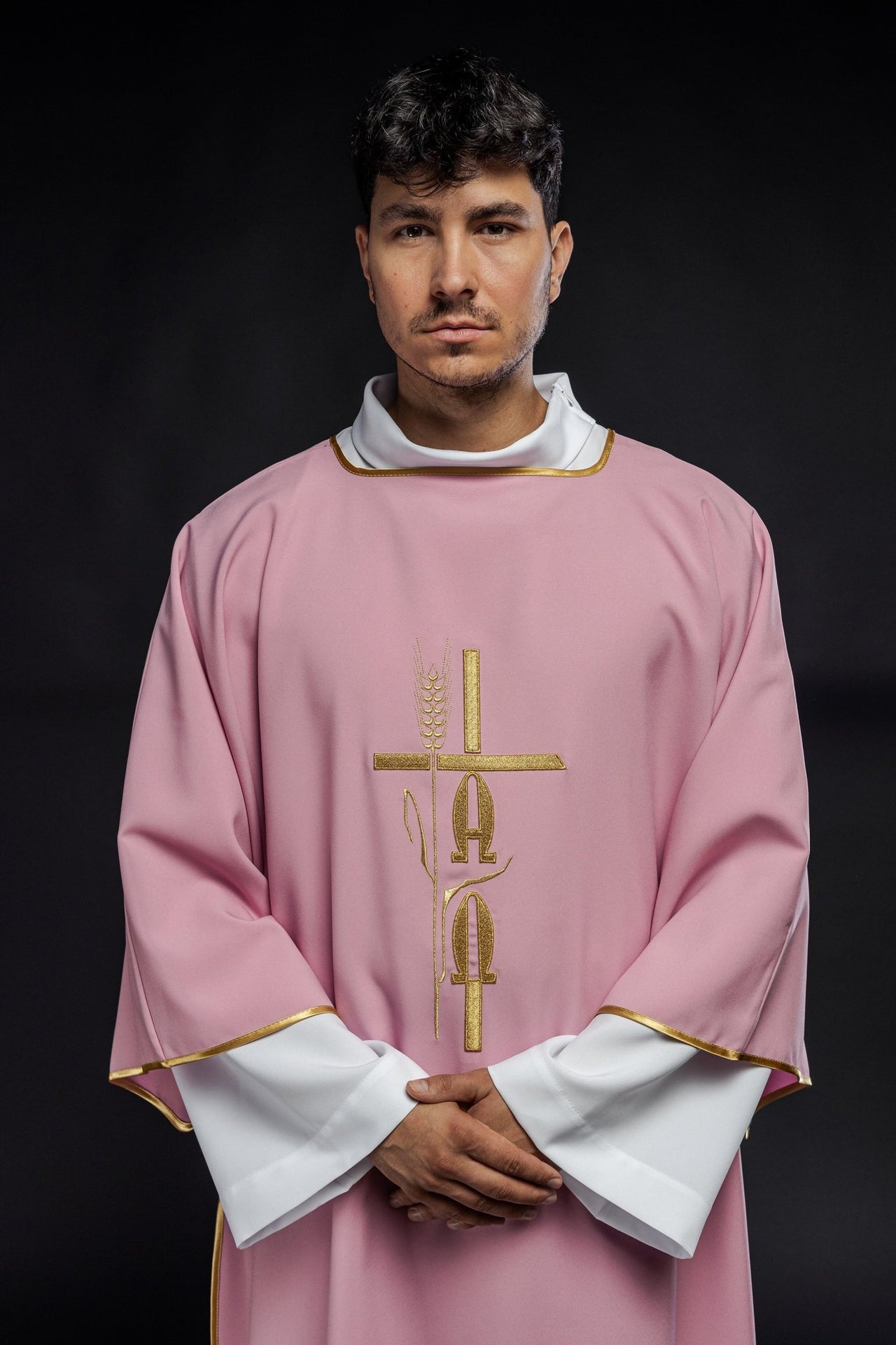 Ein dalmatisches Messgewand aus hochwertigem Stoff, verziert mit einer Stickerei mit dem eucharistischen Symbol aus Goldfäden, das das Alpha, das Omega und das Kreuz darstellt. Außerdem sind die Ränder der Kasel mit einer goldenen Satinborte versehen, die perfekt mit dem goldgestickten Alpha, Omega und Kreuz harmoniert.