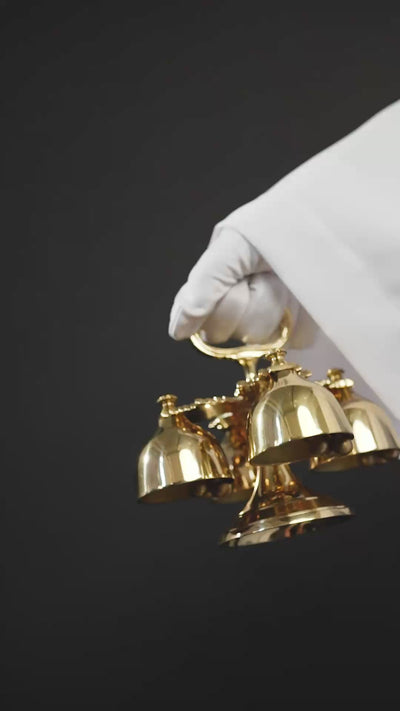 Diese einzigartigen vierfachen Glocken, aus Messingguss gefertigt und in goldener Farbe vollendet, sind eine elegante Dekoration, die eine Atmosphäre der Heiligkeit und Ruhe in den sakralen Raum bringt. Jede Glocke ist sorgfältig poliert, sodass ihre Oberfläche das Licht schön reflektiert und einen sanften Glanz in den Raum bringt.
